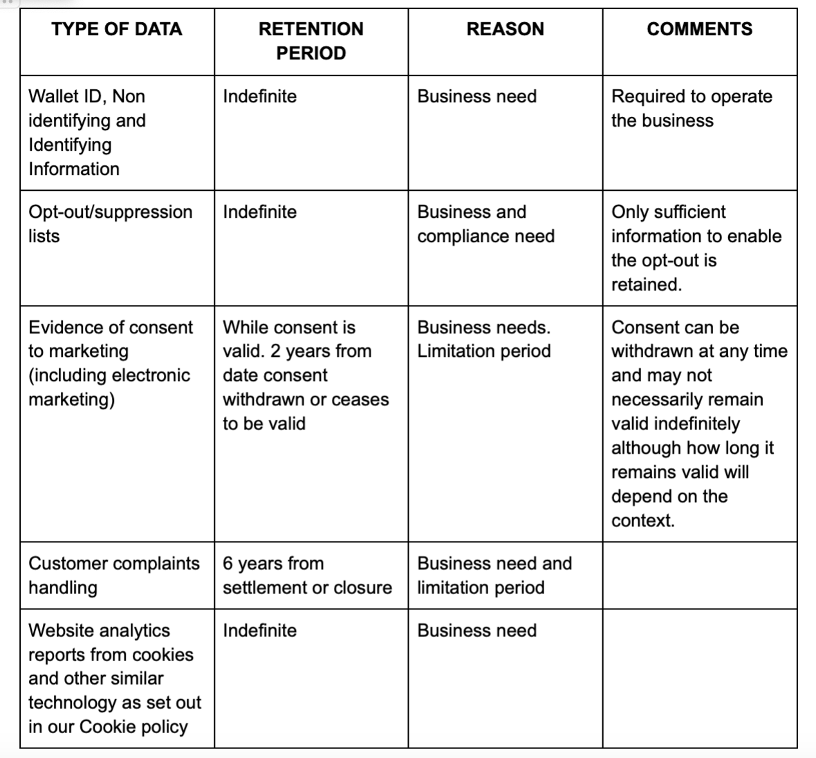 Details of how long we keep distinct aspects of your information are available in our retention policy which you can read in Figure 1 below.